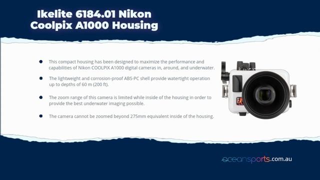 Ikelite 6184.01 Housing for Nikon Coolpix A1000 This compact housing has been designed to maximize the performance and capabilities of Nikon COOLPIX A1000 digital cameras in, around, and underwater. The lightweight and corrosion-proof ABS-PC shell provide watertight operation up to depths of 60 m (200 ft). The zoom range of this camera is limited while inside of the housing in order to provide the best underwater imaging possible. The camera cannot be zoomed beyond 275mm equivalent inside of the housing. Construction: Ikelite’s ABS-PC blend housing provides strength and corrosion-free performance year with minimal maintenance. The specially formulated colour deflects the sun to keep your camera running cooler, longer. Compared to black or clear housings, the light colour provides superior contrast for an enhanced view of the camera, LCD screen, and O-ring seal. Ikelite products are designed, built and tested in the USA. Ikelite uses locally sourced, top-grade materials. Their housings are built by hand and individually tested for fit, function and waterproof integrity. Ikelite back its products with over 50 years of experience and service within the dive industry. https://www.oceansports.com.au/photography/underwater-camera-housings/ikelite-6184-01-nikon-coolpix-a1000/