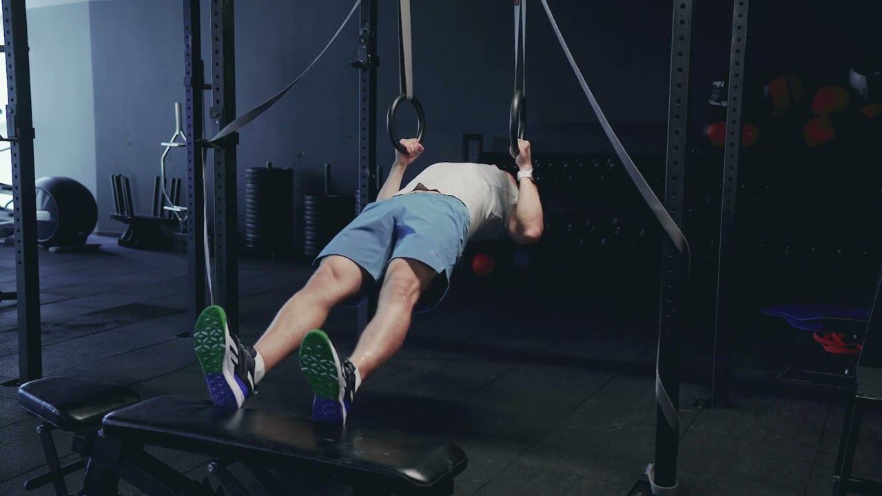 Горизонтальные изометрические подтягивания на кольцах с ногами на возвышенности/ Isometric ring row
