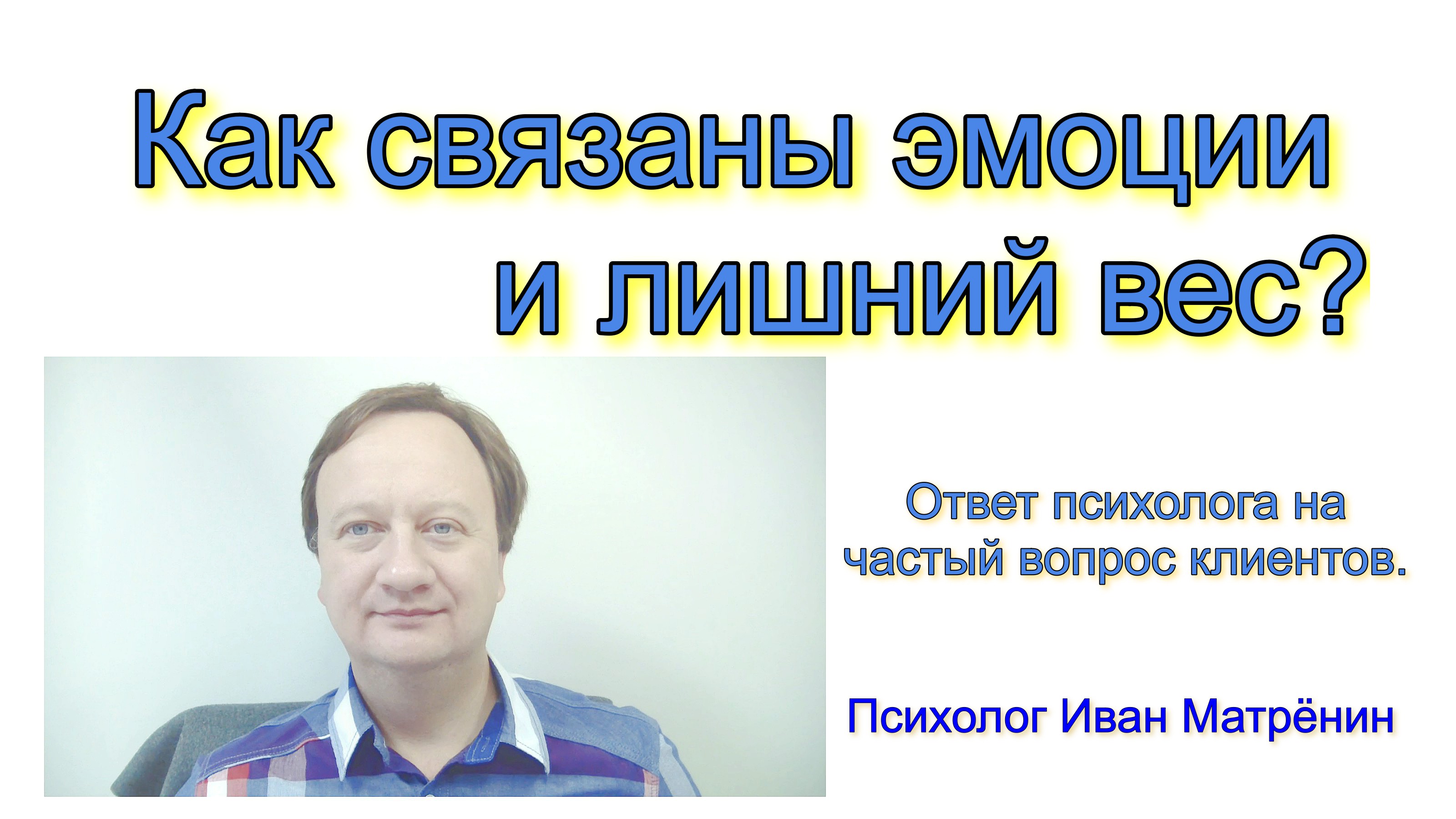 В этом видео отвечаю на частый вопрос моих клиентов о том, как же эмоции связаны с лишним весом? Часто слышал такое, что «вроде всё понятно, но в целом не понятно»! вес набирается не прямо от эмоций, эмоции приводят к перееданию, а именно переедание приводит к лишнему весу. Подробнее, в этом видео. Приятного просмотра! * Мой канал в яндекс.дзен - https://zen.yandex.ru/id/5f70d4869a7ae678ed1e96ea. Здесь много текстов и видео на эту и другие темы на стыке психологии и снижение веса. Ссылка на это видео в яндекс дзен – https://zen.me/1Kxxme https://zen.yandex.ru/media/id/5f70d4869a7ae678ed1e96ea/kak-sviazany-emocii-i-lishnii-ves-otvet-psihologa-na-chastyi-vopros-klientov-6154b7c41ec5fc1bb733b404 * Мой канал в YouTube - http://www.youtube.com/c/ПсихологИванМатрёнин. Ссылка на это видео в YouTube – https://youtu.be/pjDt5Zz10KE.