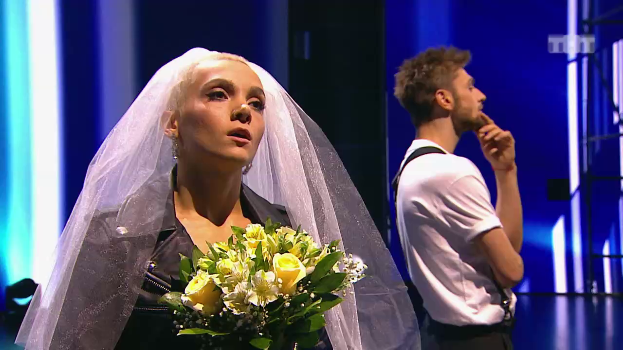 Александр и Теона рассказали историю вздорных молодожёнов. Они настолько идеально сочетались в танце, что Сергей Светлаков поверил, а наставники просто остались довольным техникой ребят.