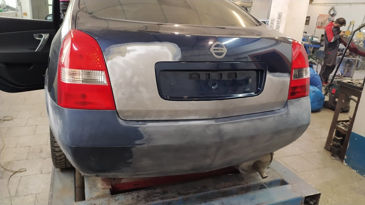 Ниссан Примера удар в зад. Восстанавливаем геометрию багажника, тянем панель. Ремонт сильно растянутого и разорванного бампера. Ремонт переломанной крышки багажника.