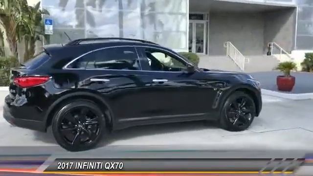 2017 INFINITI QX70 Base http://www.INFINITIofcoconutcreek.com For more information on this vehicle and our full inventory, call us at 888-460-0460 INFINITI of Coconut Creek 5501 W. Sample Road Coconut Creek FL 33073 BLACK ON BLACK SPORT WITH 21 BLACK WHEELS AND NAV BLUETOOTH BACK UP CAMERA REAR SENSORS PREMIUM STEREO UPGRADED SPORT ACCENTS THROUGHOUT PLUS MUCH MORE! COME SEE OUR SELECTION OF SPORT QX70S TODAY!!! CARFAX One-Owner. Adaptive Front Lighting System Aluminum Pedals Aluminum Roof Rails Around View Monitor w/Front & Rear Sonar System Climate Controlled Sport Style Front Seats Dark Finish Front Grille Dark Finish Lower Side Moldings Dark Finish Outside Mirror Housing Dark Finish Roof Rails Dual Occupant Memory System Entry & Exit Assist System Navigation System Outside Mirrors w/Reverse Tilt-Down Feature Power Tilt/Telescopic Steering Column Premium Package Radio: INFINITI Navigation System Red S Badge (Rear Hatch) Solid Magnesium Paddle Shifters Sport Package Wheels: 21 x 9.5 6-Spoke Enkei Aluminum-Alloy. Odometer is 6049 miles below market average! INFINITI Certified Pre-Owned Details:brbr * Warranty Deductible: $0br * Includes Rental Car and Trip Interruption Reimbursementbr * Roadside Assistancebr * Vehicle Historybr * 167 Point Inspectionbr * Limited Warranty: 72 Month/75000 Mile (whichever comes first) Limited Warranty from original in-service date for vehicles under 15000 miles 72 months/Unlimited miles from original in-service date for vehicles over 15000 miles and under 2 years old 24 months/Unlimited miles from certifiedbrbrbrReviews:brbr * Sharp handling that makes it feel more like a sport sedan than a tall SUV; plenty of passing power from the standard V6 engine; well-trimmed interior has high-quality materials throughout. Source: EdmundsbrbrbrINFINITI Of Coconut Creek proudly serving the following communities; Broward county Boca Raton Del Ray Beach West Palm Beach Parkland Margate Pompano Beach Miami Dade County Palm Beach County.