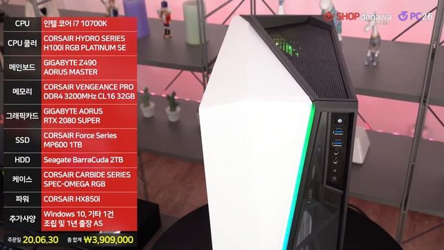 샵다나와 유튜브 조립갤러리에서는 고객님께서 직접 구성한 견적으로 주문해주신 조립컴퓨터를 배송 직전 바로 촬영하여 매일 여러분께 소개해 드립니다. 이 컴퓨터의 더 자세한 내용을 살펴보세요-http://shop.danawa.com/main/?controller=boardCompleteDeal&methods=completeDealDetail&type=assemblyGallery&orderNumberSeq=5472856 [본체 사양] -CPU : 인텔 코어 i7 10700K -CPU 쿨러 : CORSAIR HYDRO SERIES H100i RGB PLATINUM SE -메인보드 : GIGABYTE Z490 AORUS MASTER -메모리 : CORSAIR VENGEANCE PRO RGB DDR4 3200MHz(PC4-25600) CL16 32GB (16GB × 2) -그래픽카드 : GIGABYTE AORUS 지포스 RTX 2080 SUPER D6 8GB -SSD : CORSAIR Force Series MP600 1TB -HDD : Seagate BarraCuda 2TB -케이스 : CORSAIR CARBIDE SERIES SPEC-OMEGA RGB -파워 : CORSAIR HX850i 80PLUS PLATINUM -운영체제 : Microsoft Windows 10 Pro -영상 속 가격은 본체 외 기타 상품 1건 및 조립비가 포함된 총 구매 금액입니다. -본체를 제외한 소품은 연출되었습니다. ▷구독, 알림 설정으로 매일 새로운 컴퓨터를 만나보세요! #조립컴퓨터 #샵다나와 #조립갤러리
