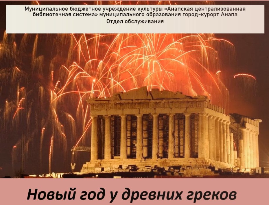 Наступает Новый год. Наш город Анапа-Мапа-Горгиппия тесно связан с Грецией (Древней Грецией). Нам хотелось рассказать о том, как отмечали приход Нового года в Древней Греции, какие правила и обычаи соблюдались, в какое время его отмечали, как веселились древние греки. Подготовлено ведущим библиотекарем сектора краеведения отдела обслуживания Центральной библиотеки г.Анапа Д.С. Селеменевым
