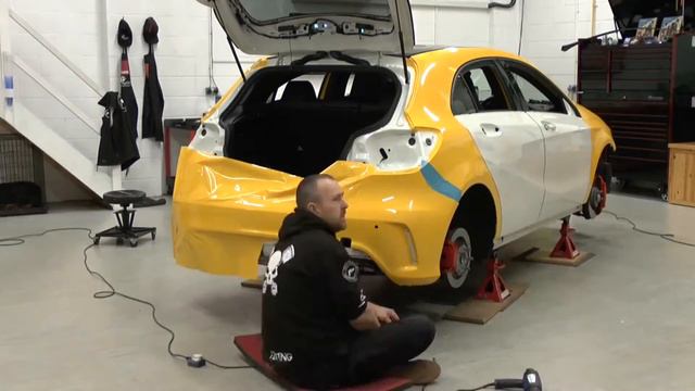 My Mercedes A45 AMG being wrapped in Avery Dennison Gloss Dark Yellow by PW Pro in Mansfield