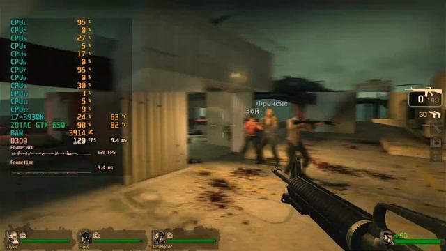 Game: Left 4 Dead Сomputer characteristics: Socket: LGA 2011 Motherboard: Asus Sabertooth X79 Processor: i7 3930K 3.20GHZ RAM: HYPER X 16GB DDR3-DIMM 1600 GPU: ZOTAC GTX 650 GDDR5 2GB ROM: SSD 128GB+HDD 500GB Video in 1920x1080 resolution. Operating system: Windows 10 Pro