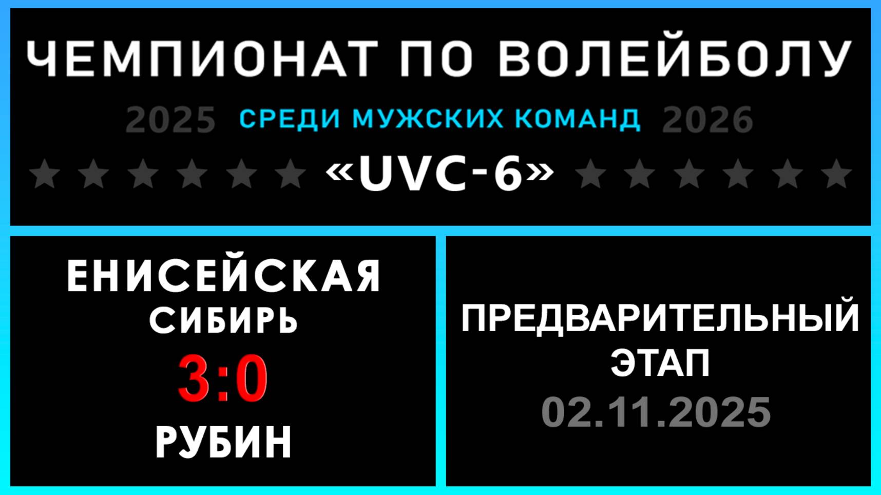 UVC-6 (Мужчины): Чемпионат UVC Лиги по волейболу среди мужских команд 2025-2026 гг. Результаты игры: Предварительный этап 02.11.2025 Енисейская Сибирь - Рубин 3:0 (25:10, 25:11, 25:20) Енисейская Сибирь не стала церемониться с Рубином - быстрая победа действующего чемпиона ТОР дивизиона! ✅ Обе команды прошли в следующий этап конкурса «РЕШАЛЫ»! ✅ 50 - количество участников «Nostradamus trophy», которые смогли предсказать точный исход матча! #UVC_ЛИГА_ЧЕМПИОНАТ_UVC_6_Мужчины