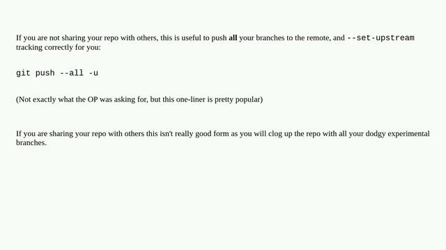How do I push a new local branch to a remote Git repository and track it too? I hope you found a solution that worked for you :) The Content (except music & images) is licensed under (https://meta.stackexchange.com/help/licensing)CC BY-SA | Thanks to all those great people for their contributions! (stackoverflow.com/users/222187/roni-yaniv)Roni Yaniv | (stackoverflow.com/users/188715/daniel-ruoso)Daniel Ruoso | (stackoverflow.com/users/894487/erichbschulz)ErichBSchulz | (stackoverflow.com/users/118606/lohrun)Lohrun | (stackoverflow.com/users/3568378/piyushmandovra)piyushmandovra | (stackoverflow.com/users/2237601/bg17aw)bg17aw | A special thanks goes out to the (https://stackoverflow.com/questions/2765421/how-do-i-push-a-new-local-branch-to-a-remote-git-repository-and-track-it-too)Stackexchange community | I wish you all a wonderful day! Stay safe :) git repository git-remote git-push git-branch