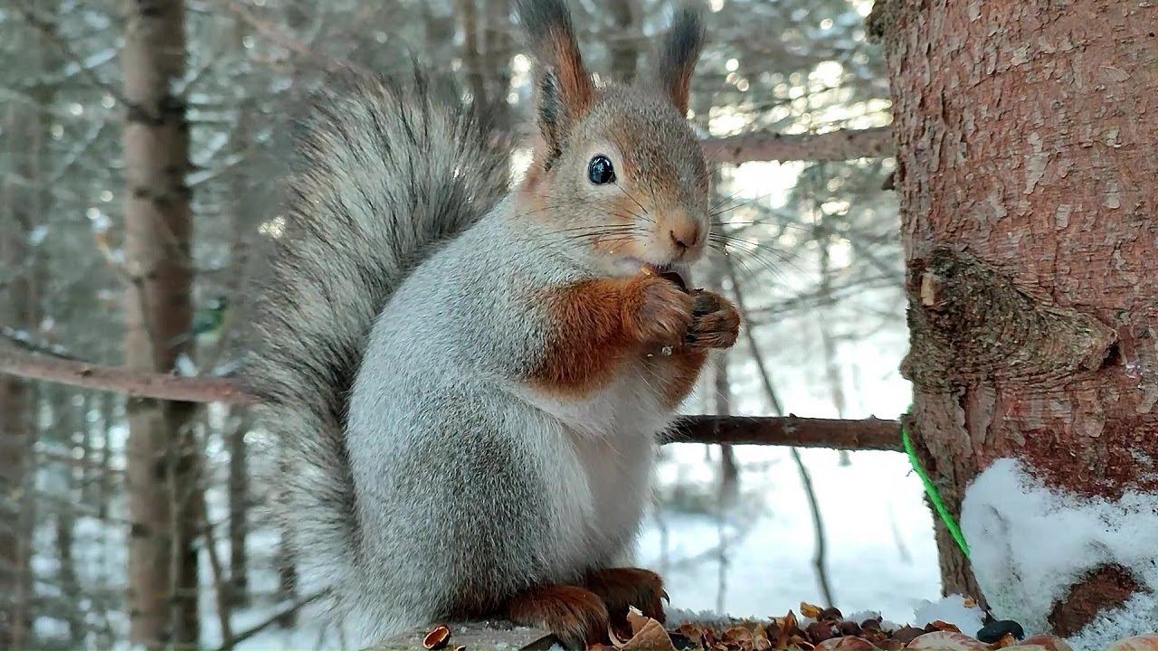 Белка отстояла кормушку и грызёт кедряшки