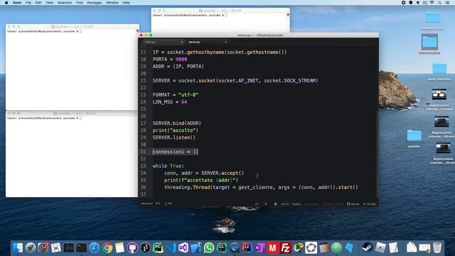 In questa serie impareremo le basi della libreria socket con riferimento al linguaggio di programmazione python. In particolare, in questo video riusciremo a fare uno scambio di messaggi fra diversi client. ------------------------------------ Codici sorgenti: https://github.com/TechAle/youtube/tree/master/Socket%20Tutorial/%5B3%5D%20Comunicazione%20Client%20-%20Client Github del tutorial: https://github.com/TechAle/youtube/tree/master/Socket%20Tutorial ----------------------------------- Sezioni: - Messaggio deciso lato cliente ( 00:00 ) - Creazione funzionalità comunicativa del server ( 01:18 ) - Programma finale ( 03:00 ) ----------------------------------- Bibliografia: - Tech With Tim Socket Tutorial https://www.youtube.com/watch?v=3QiPPX-KeSc - python.it https://www.python.it/doc/howto/Socket/sockets-it/sockets-it.html - Documentation https://docs.python.org/3/library/socket.html ----------------------------------- Tags: - #python - ITA - italiano - tutorial - #socket - client server - techale - programmazione