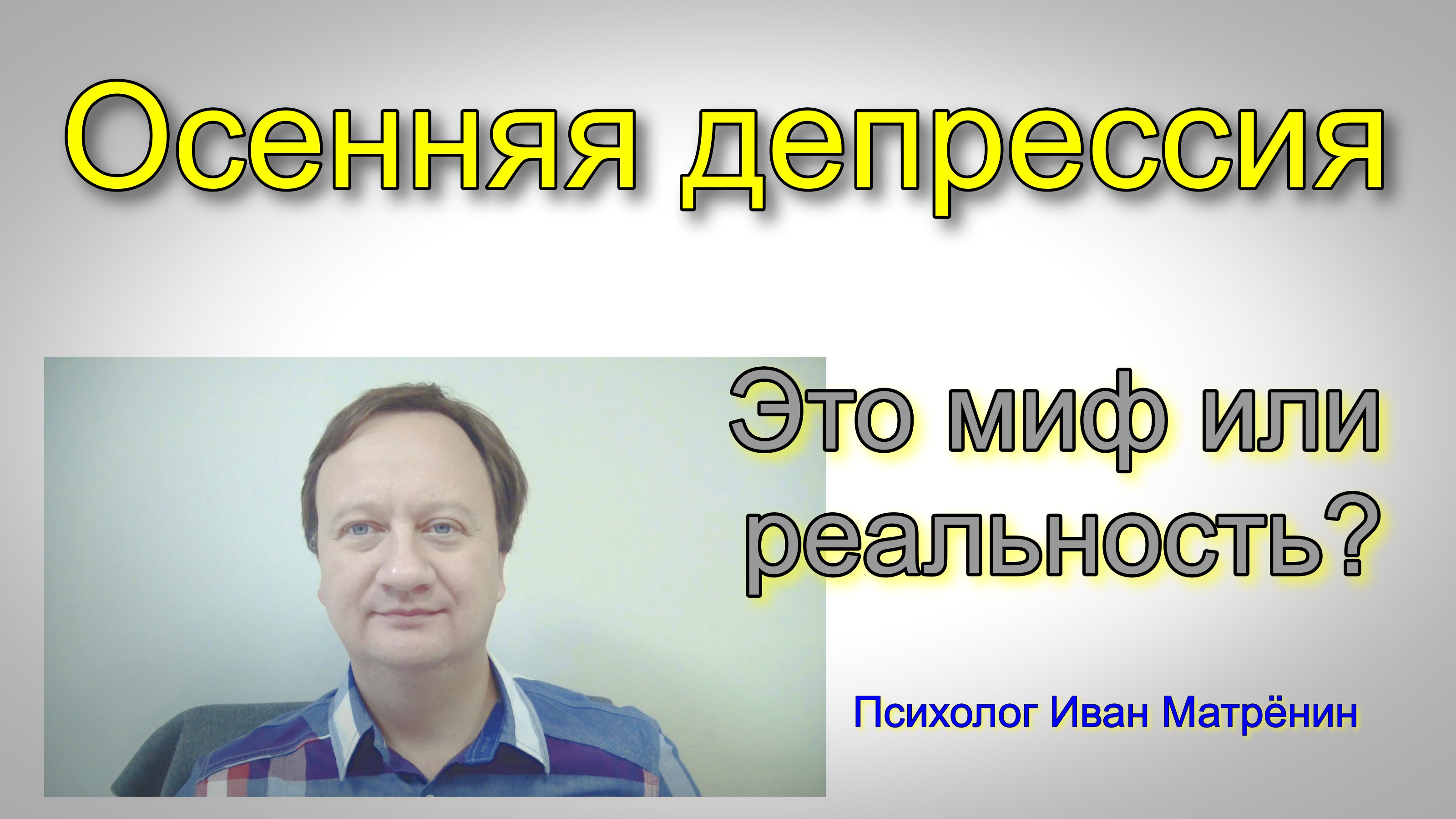 В связи с пришедшей неотвратимо пришедшей осенью, в связи с захватившей многих людей осенней хандрой или даже депрессией видео на эту злободневную тему. Извиняюсь за помехи, возникающие со звуком, даже не знал выкладывать ли это видео, но подумал, что кому тема интересна будут благодарны за это видео несмотря на эти проблемы. Здесь не про фармакологию, здесь советы от психолога о том, как быть если вас эта проблема постигла. Подробнее, в этом видео. Приятного просмотра! Мой канал в яндекс.дзен - https://zen.yandex.ru/id/5f70d4869a7ae678ed1e96ea. Здесь много текстов и видео на эту и другие темы на стыке психологии и снижение веса. Ссылка на это видео в яндекс дзен – https://zen.me/Gl6l9 https://zen.yandex.ru/media/ivanmatrenin/osenniaia-depressiia-eto-mif-ili-realnost-616ec9bac0b7f7566dcc7edb Мой канал в YouTube - http://www.youtube.com/c/ПсихологИванМатрёнин. Ссылка на это видео в YouTube – https://youtu.be/mjNHv1e36eE.