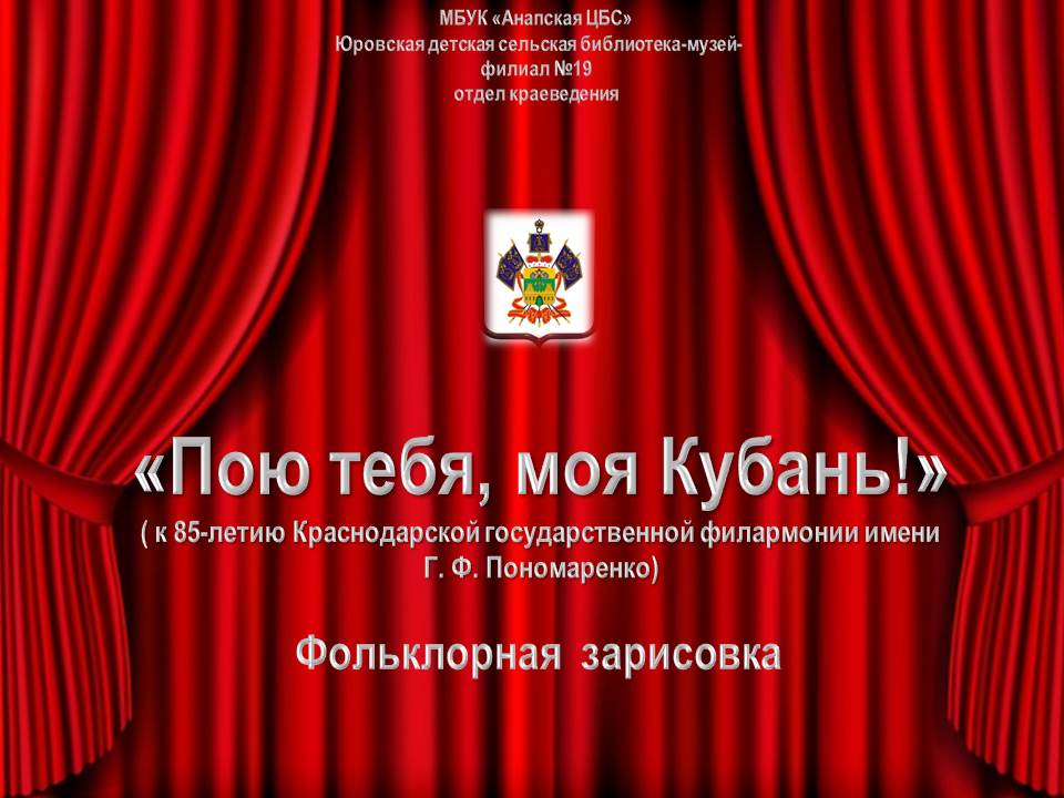 Краснодарская краевая государственная филармония была основана в январе 1939 года и уже в мае открыла свои двери для зрителей. Великая Отечественная война и немецкая оккупация Краснодара временно прервали работу филармонии. Однако вскоре после того, как город был освобождён от врага, здесь снова начали выступать эстрадные бригады, мюзик-холл, ансамбль песни и пляски и театр-аттракцион. Затем было создано множество эстрадных коллективов, которые стали известны по всей стране. Новый этап развития филармонии пришёлся на 1970-е годы, когда в Краснодар приехал работать композитор Григорий Пономаренко. В 1997 году концертному залу филармонии было присвоено его имя. Сегодня филармония состоит из около десяти крупных творческих коллективов, в составе которых — мастера искусств, таланту которых рукоплескали жители не только Кубани и России, но и Германии, Франции, Норвегии, Польши, Болгарии и Греции. К юбилею, 85-летию со дня основания Краснодарской государственной филармонии имени Г. Ф. Пономаренко, мы представляем фольклорную зарисовку под названием «Пою тебя, моя Кубань!». Подготовлено заведующим отделом краеведения Юровской детской сельской библиотеки-музея-филиала № 19 И. В. Димитрашко