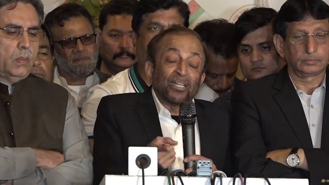 Dr. Farooq Sattar talking to media with MQM Pakistan leaders outside Bahadurabad Markaz