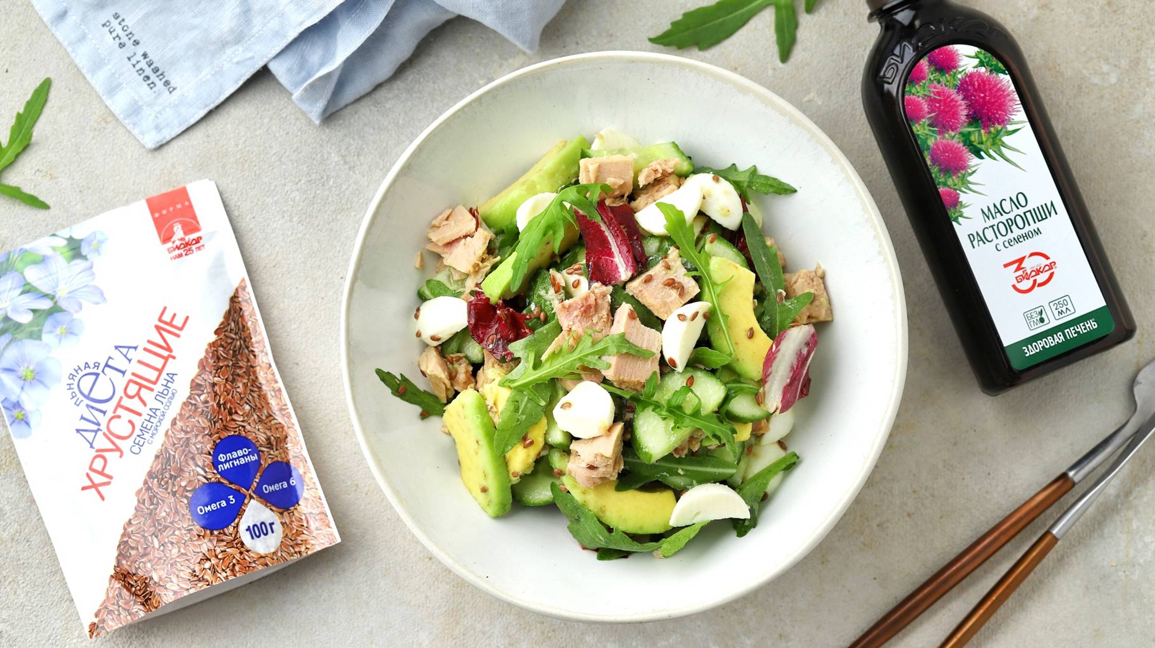 Салат с тунцом, авокадо, маслом расторопши и семенами льна "Биокор"
