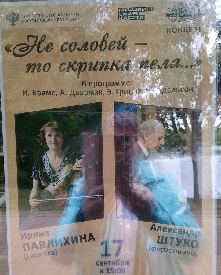 Вашему вниманию предложено пять фрагментов из небольшого концерта, прозвучавшего в овальном зале дворца "Остафьево"-"Русский парнас". На первом кадре вы видите самых первых слушателей. На последнем кадре-афиша концерта, висящая на стеклянной стенке сувенирного павильона, расположенного за входом на территорию усадьбы. Это музыка вне времени, можно слушать всегда. Исключительно гармонирует с имением Вяземских-Шереметьевых, осеннему времени года. Мы получили истинное удовольствие. Желаю Вам приятного прослушивания.