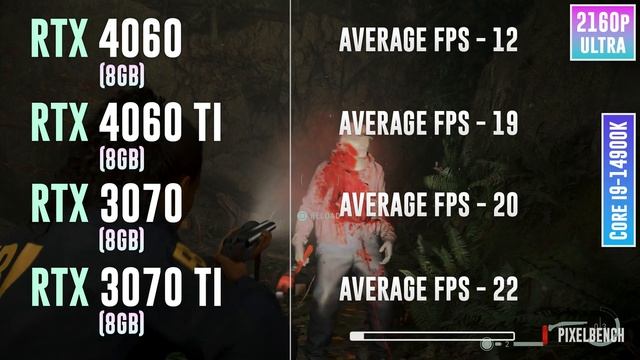 RTX 4060 vs RTX 4060 TI vs RTX 3070 vs RTX 3070 TI - Test in 15 Games 1080p, 1440p, 2160p, 2k, 4k ⏩GPUs & Amazon US⏪ (Affiliate links) - RTX 4060 8GB: https://amzn.to/3NskoYp - RTX 4060 TI 8GB: https://amzn.to/3NldmFR - RTX 3070 8GB: https://amzn.to/41DHVfK - RTX 3070 TI 8GB: https://amzn.to/3TzYIOH ⏩PC Setup⏪ - System: Windows 11 Professional 64-bit - Processor: Core I9 14900K - Air Cooling: Noctua NH-D15 Chromax Black - Motherboard: Z790 AORUS Elite AX - Memory RAM: Corsair Vengeance RGB 32GB DDR5 - 7200 Mhz - Power Supply: Be Quiet! Pure Power 12 M 1000W - M.2: Crucial P5 Plus 2TB - Case: DeepCool CH510 ?♂️ When you buy from my Amazon links, I earn a small commission at no extra cost to you, plus you support the channel thank you.