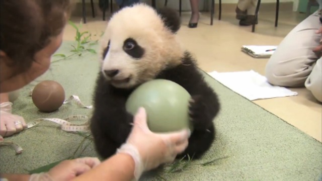 Малыш панды играет с мячиком.