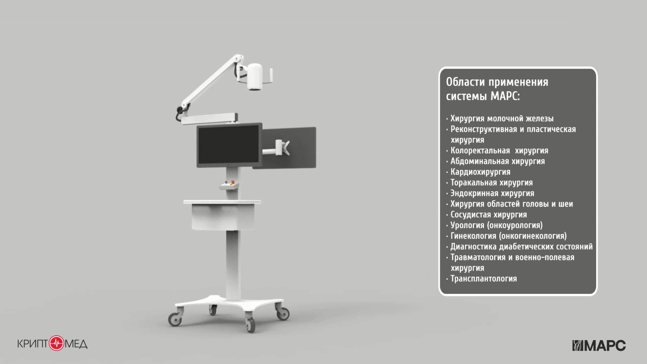 Система МАРС предназначена для наблюдения за кровотоком в артериальном и венозном русле, лимфотоком, перфузией органов и тканей, в том числе в ходе хирургической операции. Для проведения диагностики с помощью данной системы в качестве флуоресцирующего красителя применяется индоцианин зеленый (ICG). Заказать данное оборудование можно на нашем сайте - https://www.kriptomed.ru/product/apparat-dlya-spirometrii-mir-v-ispolnenii-smart-one-s-prinadlezhnostyami/ 🔥 Сайт компании: www.kriptomed.ru ★Добавляйтесь в соц. сети★ YouTube: https://www.youtube.com/@kriptomed/videos Vkontakte: https://vk.com/public213471077 Telegram: https://t.me/kriptomed