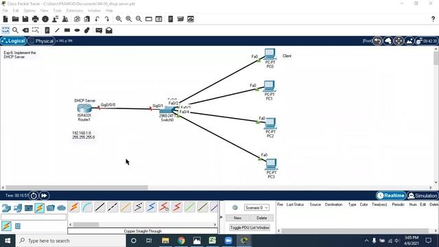 DHCP Configuration in CISCO Packet Tracer • Dynamic Host Configuration Protocol (DHCP) is an application layer protocol used to distribute various network configuration parameters to devices on a TCP/IP network. – IP addresses subnet masks, default gateways, DNS servers, etc. • DHCP employs client-server architecture; a DHCP client is configured to request network parameters from a DHCP server on the network. • A DHCP server is configured with a pool of available IP addresses and assigns one of them to the DHCP client. • A Cisco router can be configured as a DHCP server.
