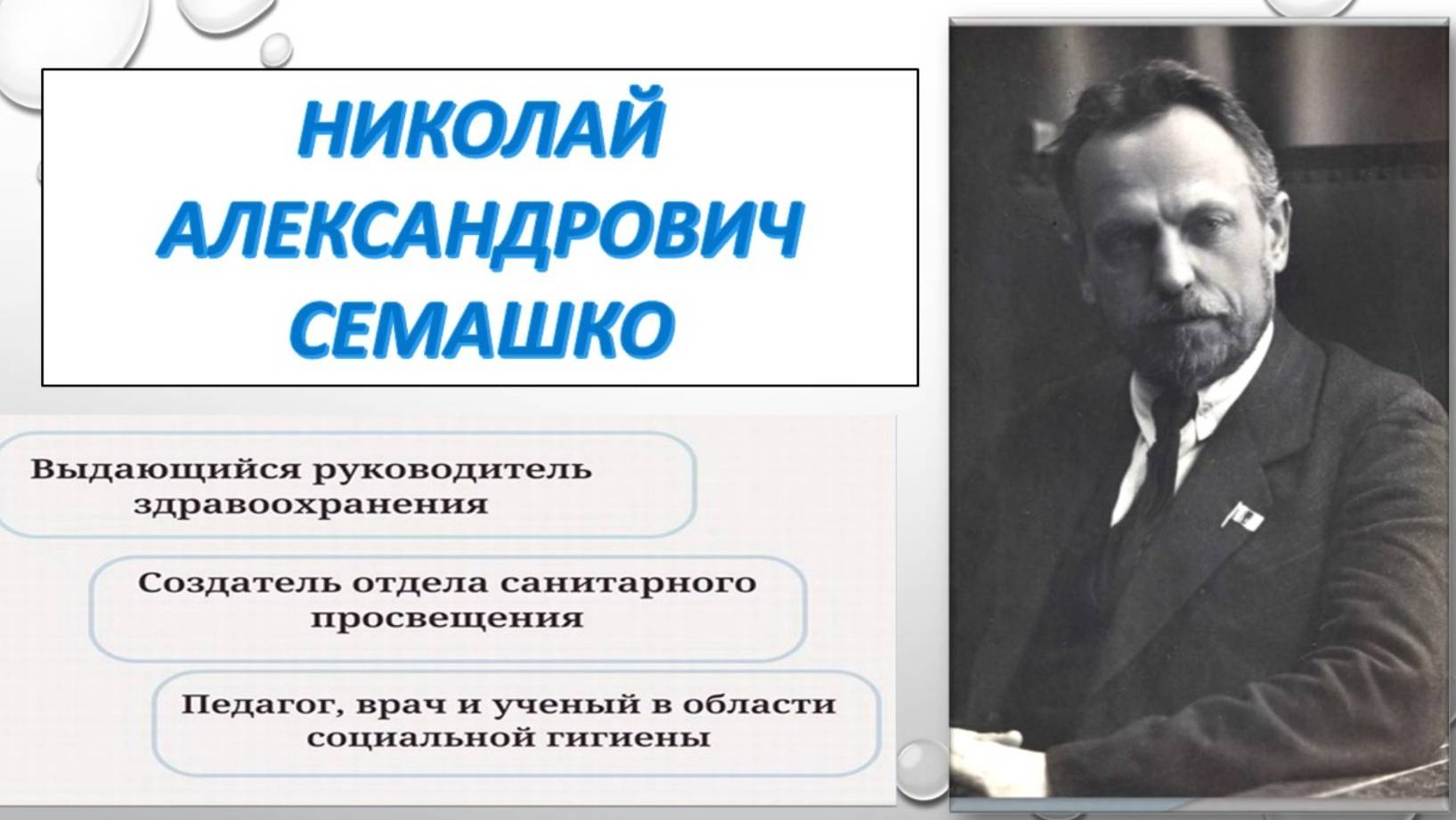Николай Александрович Семашко (1874–1949) — врач, государственный деятель, один из организаторов системы здравоохранения в СССР. При его непосредственном участии были осуществлены мероприятия, направленные на создание в стране сети медицинских учреждений, на решение вопросов профилактики, охраны материнства и детства, введён метод диспансеризации, организовано санитарное дело, введено санитарное просвещение, организованы сельское здравоохранение, санаторно-курортное дело и многое другое. Деятельность народного комиссара профессора Николая Александровича Семашко была признана на научном (академик АМН СССР и АПН РСФСР) и государственном уровне: он награждён орденом Ленина и орденом Трудового Красного Знамени, многими медалями. Подготовлено заведующим Гайкодзорской сельской библиотекой-филиалом №11 Ж.М. Газарян.
