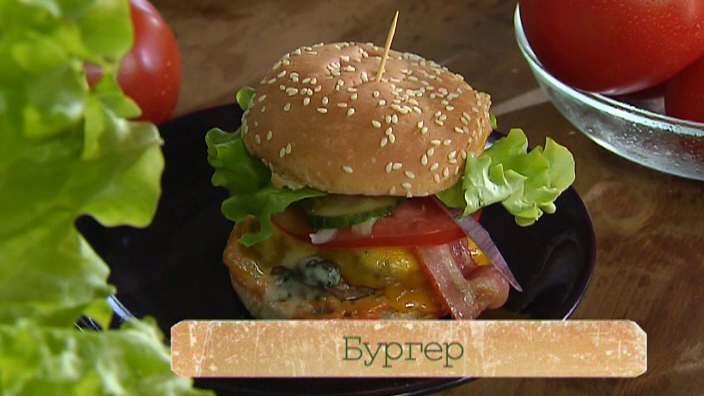 Приготовление домашних бургеров начнём с маринованных огурчиков. Для маринада смешиваем стакан уксуса и стакан воды, добавляем две столовые ложки мёда, одну столовую ложку тёртого имбиря, ложку горчичных зёрен, ложку соли и лавровый лист, доводим до кипения и заливаем порезанные огурчики, оставляем на 20 минут. В говяжий фарш добавляем мелко нарезанные лук и чеснок, немного кефира, чтобы котлетки получились мягкими и сочными. Жарим их на сковороде гриль. Бекон жарим в духовке на сухом противне, красный лук и помидоры режем кольцами, лисички обжариваем на оливковом масле. Для соуса смешиваем майонез, кетчуп и горчицу, смазываем им булочки, выкладываем котлетки, добавляем сыр с плесенью и сыр чеддер и отправляем в духовку на пару минут, чтобы сыр расплавился. Собираем бургеры, кладём в них всю приготовленную начинку, закрываем и закрепляем зубочисткой. Приятного аппетита!