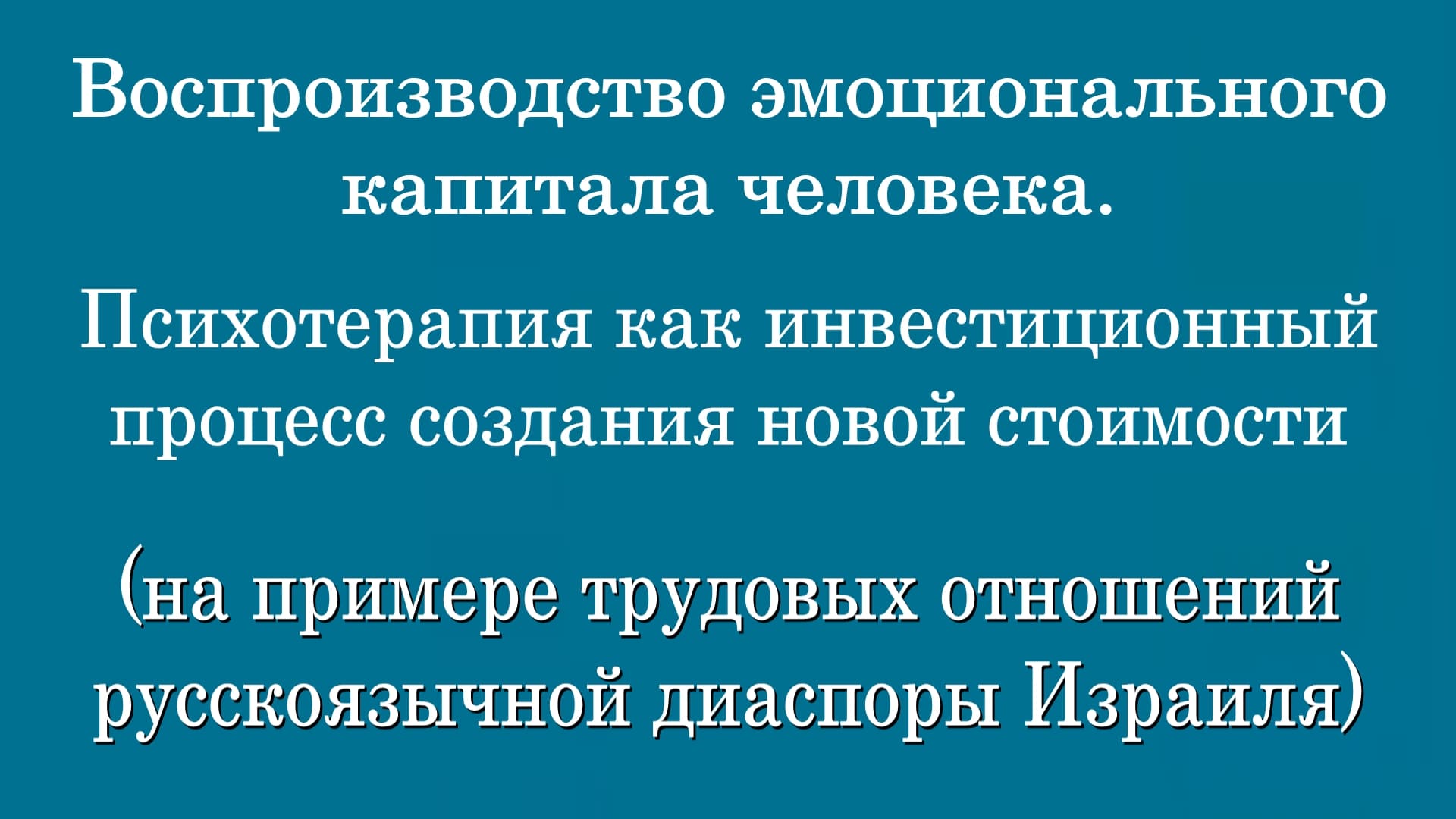 II ВСЕМИРНЫЙ КОНГРЕСС РУССКОЯЗЫЧНЫХ ПСИХОТЕРАПЕВТОВ И ПСИХОЛОГОВ (06.11.2023) - https://www.youtube.com/watch?v=r1lTEbzA_iY - https://www.youtube.com/watch?v=71ujpWZ6_lY - https://home.strannik-j.org/video/f122908658057b11bbf01016d20fbe0f/ - https://vimeo.com/manage/videos/883348539 - https://ok.ru/video/6712459135521 - https://dzen.ru/video/watch/654c9c973b3f472e350965a2 - https://www.tiktok.com/@petrshamraev/video/7299474802404805889?lang=ru-RU - https://vk.com/club177706740?z=video-177706740_456246188%2Fa154956dac6cb1c031%2Fpl_wall_-177706740 Колпакова Ольга Николаевна Доктор экономических наук, PhD, главный учёный Психотерапевтического Исследовательского Центра, автор 53 научных работ, из них 7 монографий, посвященных эмоциям и эмоциональному капиталу, разработчик методики повышения эмоционального капитала при хронических заболеваниях (Израиль, Беэр-Шева) Выступление. «Воспроизводство эмоционального капитала человека. Психотерапия как инвестиционный процесс создания новой стоимости (на примере трудовых отношений русскоязычной диаспоры Израиля)» Звоните, задавайте вопросы: - Skype: hembra7 - E-mail: kaif.olga@yandex.com - https://www.youtube.com/@user-tb6ej6ol2b Дополнительную информацию можно получить по скайпу: petrshamraev с 8:00 до 22:00 (время московское) Руководитель Психотерапевтического Исследовательского Центра автор открытия в области медицины психолог-психотерапевт Петр Шамраев Тел: +972-52-529-95-91 Тел: +972-52-634-67-74 WhatsApp: +972526346774 Skype: petrshamraev E-mail: petrshamraev@gmail.com Web: http://shamraev.co.il YouTube: https://www.youtube.com/@user-di4oi5lk7q YouTube: https://www.youtube.com/@user-tb6ej6ol2b/videos YouTube: https://www.youtube.com/channel/UCBsxIQzzHaDglyTg7J6Bl1A RuTube: https://home.strannik-j.org/channel/10134425/videos/ Одноклассники: https://ok.ru/kakvylech Вконтакте: https://vk.com/id342874893 Dzen.ru: https://dzen.ru/id/60c06e755fe9c068e6ba4b1d Vimeo: https://vimeo.com/user183147794 Livejournal: https://petrshamraev.livejournal.com/ TikTok: https://www.tiktok.com/@petrshamraev?lang=ru-RU Instagram: https://www.instagram.com/petr._shamraev/ Facebook: https://www.facebook.com/profile.php?id=61556761587044 Подпишитесь на мой канал, и вы всегда будете в курсе последних открытий #петршамраев #каквылечитьрассеянныйсклероз #эмоциональныйкапитал