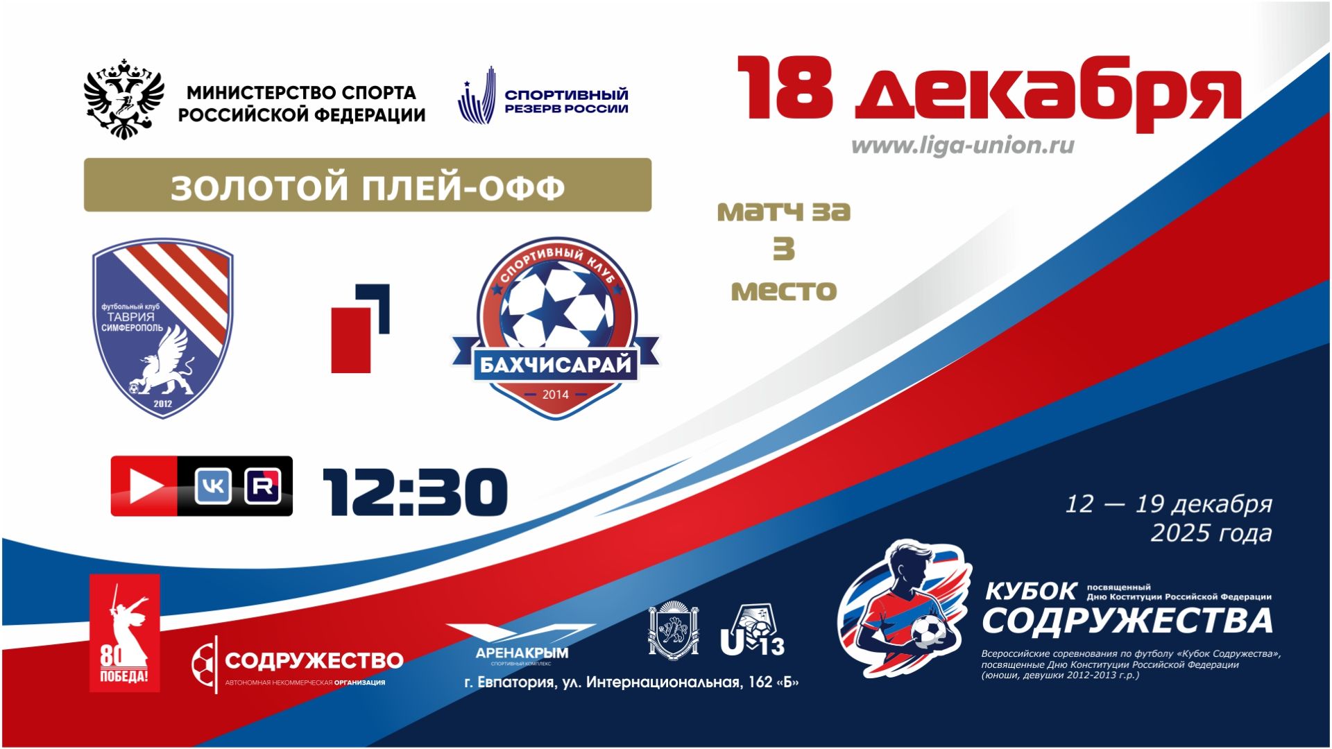 «Кубок Содружества» | Золотой плей-офф | Матч за 3 место | СШ №3 им. Н.Т. Гостева «Таврия» (г. Симферополь, РК) – СК «Бахчисарай» (г. Бахчисарай, РК) | 18.12.2025 | 12:30