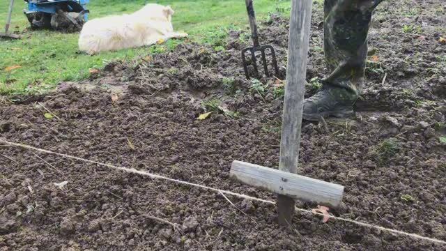Деревенская наша жизнь и наших питомцев, сажаем чеснок, озимый лук, пес Ричик играет чесноком