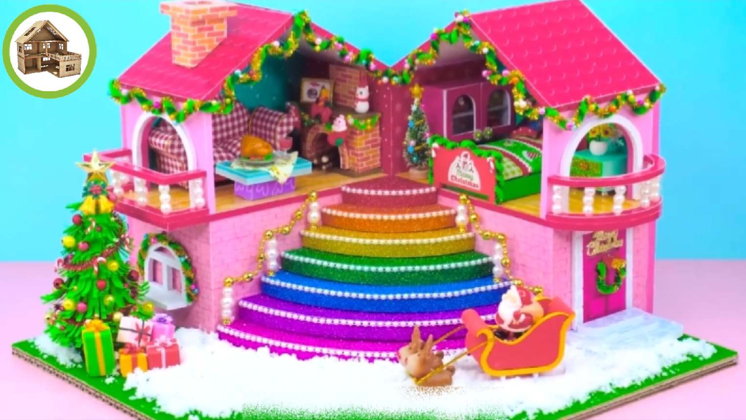 Новогодний милый домик дед мороз и много разных подарков из картона #53