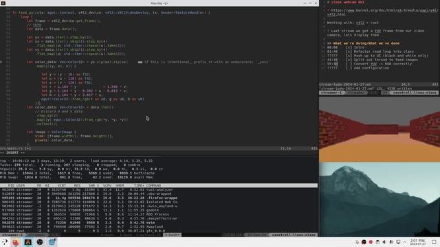 00:00 Intro 01:40 Refactor read loop into class 17:30 Hook up to UI (black and white only) 44:30 Split out thread to feed images 55:10 Convert YUV to RGB correctly 01:09:00 Fix hardcoded image size 01:14:40 Add configuration
