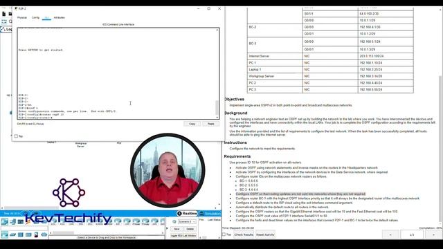 In this episode we are going to look at configuring Single-Area OSPFv2 Configuration. You are helping a network engineer test an OSPF set up by building the network in the lab where you work. You have interconnected the devices and configured the interfaces and have connectivity within the local LANs. Your job is to complete the OSPF configuration according to the requirements left by the engineer. Use the information provided and the list of requirements to configure the test network. When the task has been successfully completed, all hosts should be able to ping the internet server. We will be Implement single-area OSPFv2 in both point-to-point and broadcast multiaccess networks. Thank you so much for watching this episode of my series on Configuration Examples for the Cisco Certified Network Associate (CCNA). Once again, I’m Kevin and this is KevTechify. Let’s get this adventure started. All my details and contact information can be found on my website, https://KevTechify.com YouTube Channel: https://YouTube.com/KevTechify ------------------------------------------------------- Cisco Certified Network Associate (CCNA) Enterprise Networking, Security, and Automation v3 (ENSA) Single-Area OSPFv2 Configuration Packet Tracer Lab 2.7.1 - Single-Area OSPFv2 Configuration Lab Number: 67 ------------------------------------------------------- Equipment I like. Home Lab ►► https://kit.co/KevTechify/home-lab Networking Tools ►► https://kit.co/KevTechify/networking-tools Studio Equipment ►► https://kit.co/KevTechify/studio-equipment