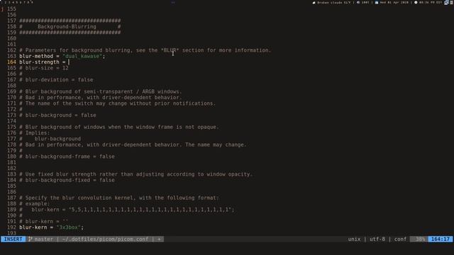 A guide to setting up kawase window blur with picom (new name for compton). AUR: https://aur.archlinux.org/packages/picom-tryone-git/ Github: https://github.com/tryone144/compton/tree/feature/dual_kawase Arch Wiki: https://wiki.archlinux.org/index.php/Picom