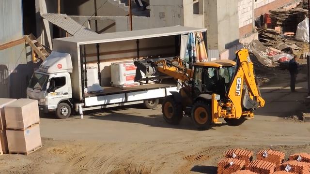 Экскаватор погрузчик разгружает фургон.