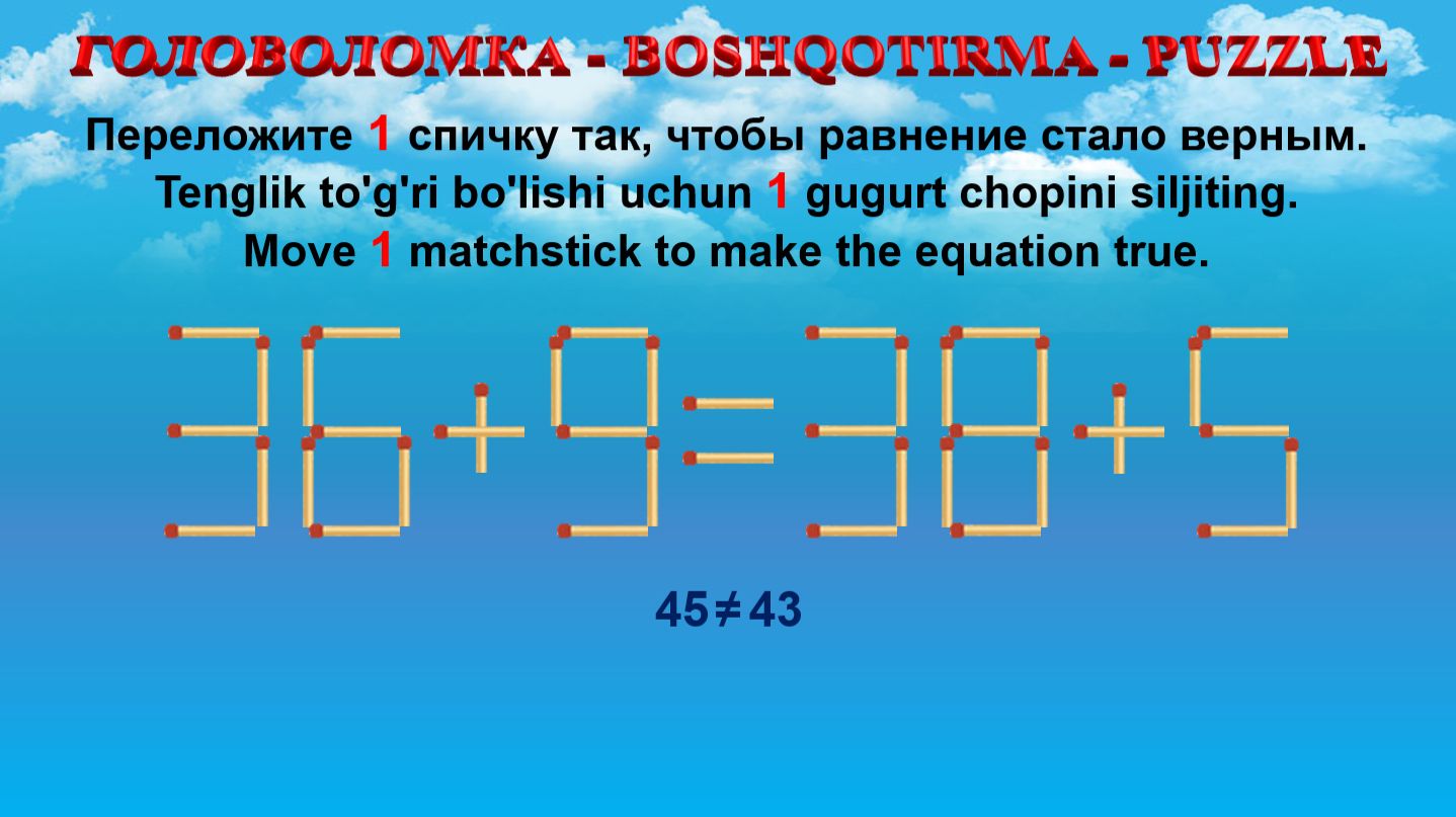 ГОЛОВОЛОМКА - BOSHQOTIRMA – PUZZLE. Спичка. 36+9=38+5, 36+9=38+5, 32+3=35+8, 34+9=38+6