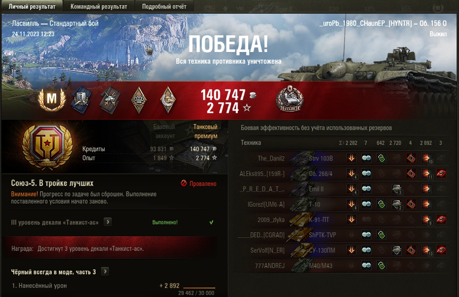 ЛАСВИЛЛЬ МАСТЕР на Об. 156 О ОПЫТ: 1681 СУММАРНЫЙ УРОН: 5816 медаль СТАРКА