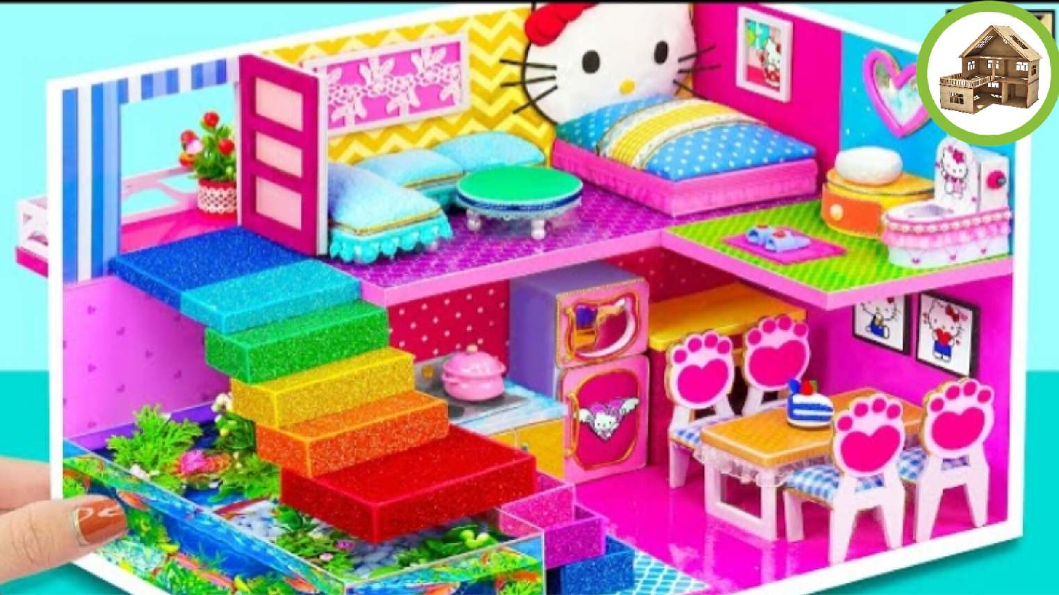 Миниатюрный домик hello kitty с милой гостевой и ванной комнатой, кухней и аквариумом из картона|115