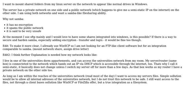 Windows network share on linux server without samba Helpful? Please support me on Patreon: https://www.patreon.com/roelvandepaar With thanks & praise to God, and with thanks to the many people who have made this project possible! | Content (except music & images) licensed under CC BY-SA https://meta.stackexchange.com/help/licensing | Music: https://www.bensound.com/licensing | Images: https://stocksnap.io/license & others | With thanks to user ZaB (superuser.com/users/115585), user user629926 (superuser.com/users/105825), user Joel Coehoorn (superuser.com/users/1304), user Der Hochstapler (superuser.com/users/36744), user Baarn (superuser.com/users/65379), and the Stack Exchange Network (superuser.com/questions/383023). Trademarks are property of their respective owners. Disclaimer: All information is provided "AS IS" without warranty of any kind. You are responsible for your own actions. Please contact me if anything is amiss at Roel D.OT VandePaar A.T gmail.com