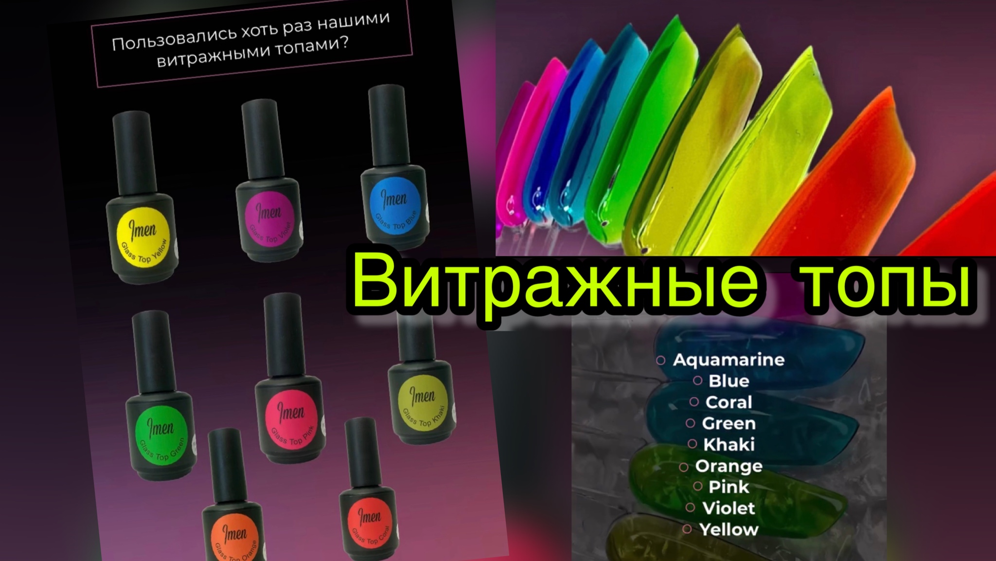 Пользовались хоть раз нашими витражными топами❓ Жидкой консистенции. С глянцевым блеском? Кроме того, что они ускоряют работу, с ними ещё можно создать массу интересных и быстрых дизайнов. Идеальные для создания аквариумных дизайнов, хрустальных ногтей и эффекта глубокого цвета, перекрыть им стемпинг? Быстро и просто? В наличии 9 оттенков топа: Green - Артикул на WB: 100710875 https://www.wildberries.ru/catalog/100710875/detail.aspx?targetUrl=MS&size=158733002 Khaki - Артикул на WB: 100710869 https://www.wildberries.ru/catalog/100710869/detail.aspx?targetUrl=MS&size=158732996 Yellow - Артикул на WB: 100710868 https://www.wildberries.ru/catalog/100710868/detail.aspx?targetUrl=MS&size=158732995 Violet - Артикул на WB: 100710867 https://www.wildberries.ru/catalog/100710867/detail.aspx?targetUrl=MS&size=158732994 Pink - Артикул на WB: 100710873 https://www.wildberries.ru/catalog/100710873/detail.aspx?targetUrl=MS&size=158733000 Coral - Артикул на WB: 100710866 https://www.wildberries.ru/catalog/100710866/detail.aspx?targetUrl=MS&size=158732993 Aquamarine - Артикул на WB: 100709295 https://www.wildberries.ru/catalog/100709295/detail.aspx?targetUrl=MS&size=158730699 Blue - Артикул на WB: 100710872 https://www.wildberries.ru/catalog/100710872/detail.aspx?targetUrl=MS&size=158732999 Orange - Артикул на WB: 100710870 https://www.wildberries.ru/catalog/100710870/detail.aspx?targetUrl=MS&size=158732997 Онлайн магазин www.imennails.ru