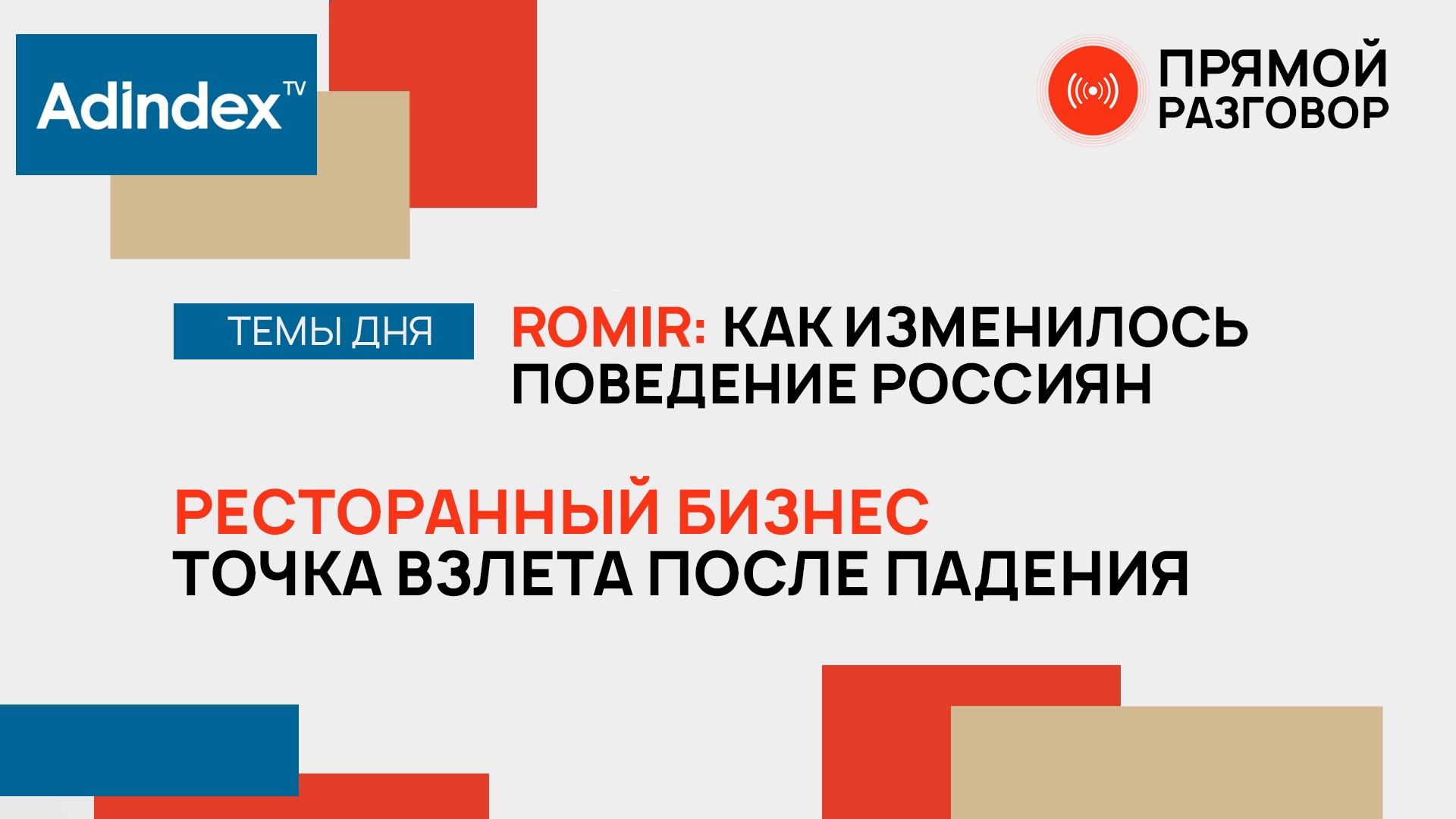 Каждый день в студии AdIndex мы говорим с представителями бизнеса разного масштаба о том, что сейчас действительно происходит в экономике, как компании справляются с ситуацией дезориентации и тревогой за свое дело, как поддерживают сотрудников и борются за клиентов. Гости эфира: - Ксения Пайзанская, старший директор по работе с клиентами «Ромир» - Константин Самарин, совладелец ресторана «ФЛЁР» и кафе UNTITLED - Сабина Потоцкая, основательница HOLI yoga & cafe *В эфире могут упоминаться социальные сети Instagram и Facebook — организации признаны экстремистскими и запрещены на территории Российской Федерации.