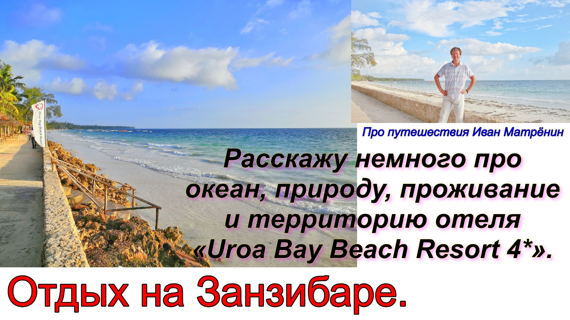 Это видео сделано мной в декабре 2020 года, когда мы отдыхали на Занзибаре в местечке Уроа (Uroa). Это видео, как я часто делаю, снимал «с рук». Это значит, что временами страдает качество картинки и звук, но зато вы видите реальные кадры, не подверженные специальной обработке, которая может изменить общее представление о месте и событиях там. Я вместе с вами гуляю по территории отеля «Uroa Bay Beach Resort 4*», что-то рассказываю про природу на территории отеля и на Занзибаре в целом, показываю море, немного рассказываю о нашей жизни тут. Когда ехали на Занзибар отзывов про отель и сам остров было не так уж много. Надеюсь, моё видео поможет вам составить своё мнение об этих местах. Смотрите! Видео можно посмотреть: На моём канале в яндекс.дзен, «Про путешествия. Иван Матрёнин». Адрес в Дзене - https://zen.yandex.ru/travelblogger. Ссылка на это видео - https://zen.yandex.ru/media/travelblogger/otdyh-na-zanzibare-rasskaju-nemnogo-pro-okean-prirodu-projivanie-i-territoriiu-otelia-uroa-bei-bich-uroa-bay-beach-resort-4-5ff20707af142f0b1773d184. На моём канале в YouTube - ищите Travel blogger Ivan Matrenin. Ссылка на это видео - https://youtu.be/oe-5iskcNC0 Ссылка на это видео: в Rutube - https://home.strannik-j.org/video/fd6bde5b32603e6a84a2fa24bcd6c328/ Вконтакте - https://vk.com/video19642848_456239937