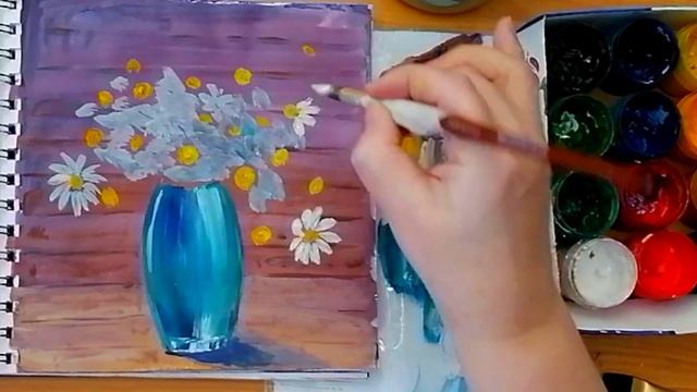 Рисуем просто. Букетик ромашек в красивой вазе гуашью.
