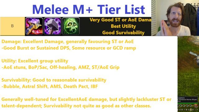 In this video I put together a tier list for M+ dungeons in Dragonflight, highlighting the advantages and deficiencies of the various Melee DPS specs. Tier lists are mostly for fun, so take it with a grain of salt! Enjoy 0:00 Introduction 0:25 S-tier 1:43 A-tier 3:34 B-tier 6:02 C-tier 8:25 D-tier 10:24 Conclusion